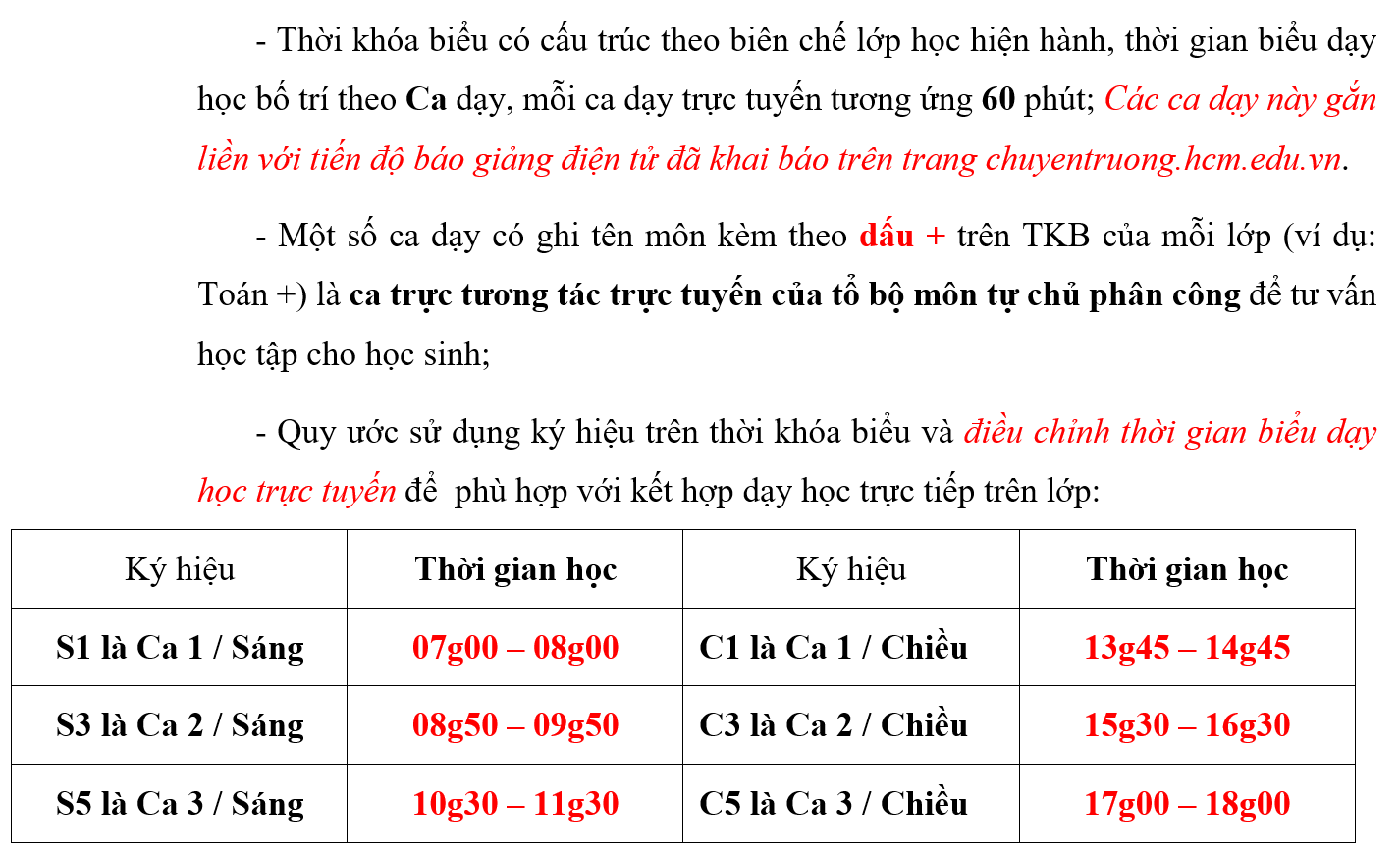 Học sinh khối 10, 11 lưu ý ký hiệu và thời gian biểu ca học Online (có thay đổi so với trước đây):