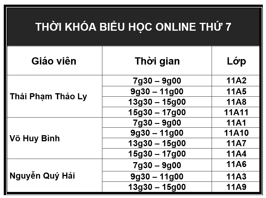 Lưu ý: Thời gian biểu của 5 lớp phụ đạo đối tượng 3 (HS chưa hoàn thành học tập Online)